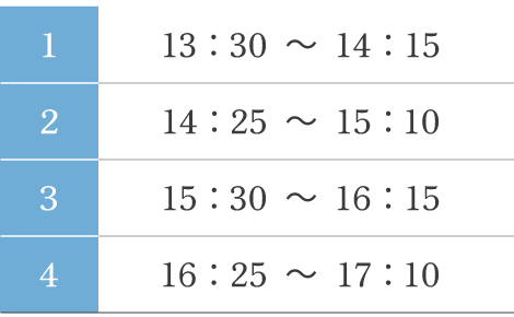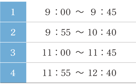 午前クラス 9:00~12:40 / 午後クラス 13:30~17:10