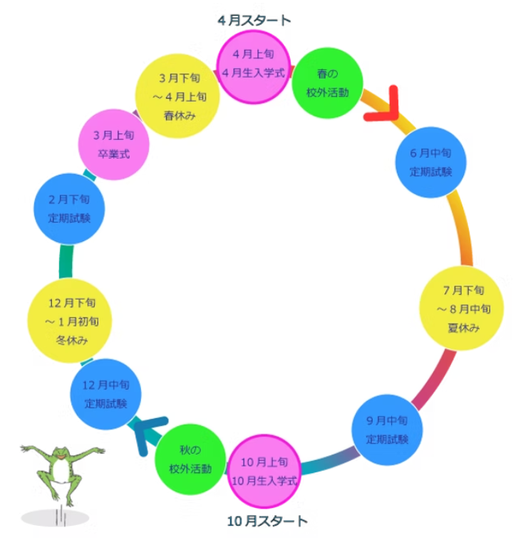 北海道アスクゲート日本語学校札幌本校の年間スケジュールです。入学は4月と10月、春と秋には校外活動を行います。